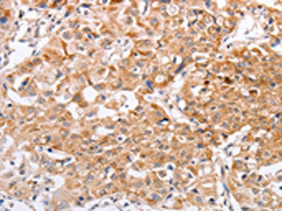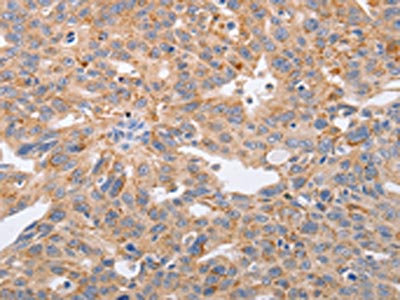 The image on the left is immunohistochemistry of paraffin-embedded Human ovarian cancer tissue using CSB-PA559752(PPP1CB Antibody) at dilution 1/40, on the right is treated with fusion protein. (Original magnification: ×200)