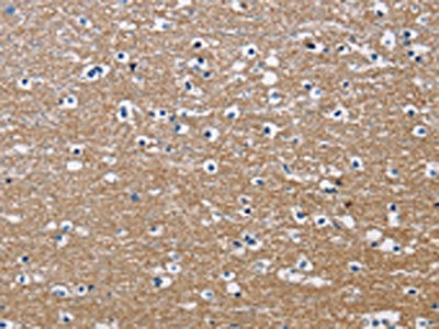 The image on the left is immunohistochemistry of paraffin-embedded Human brain tissue using CSB-PA916143(PPP3CA Antibody) at dilution 1/30, on the right is treated with fusion protein. (Original magnification: ×200)