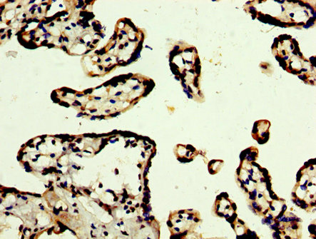 IHC image of CSB-PA878858LA01HU diluted at 1:300 and staining in paraffin-embedded human placenta tissue performed on a Leica BondTM system. After dewaxing and hydration, antigen retrieval was mediated by high pressure in a citrate buffer (pH 6.0). Section was blocked with 10% normal goat serum 30min at RT. Then primary antibody (1% BSA) was incubated at 4°C overnight. The primary is detected by a biotinylated secondary antibody and visualized using an HRP conjugated SP system.