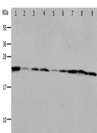 Gel: 12%SDS-PAGE, Lysate: 40 μg, Lane 1-9: Mouse liver tissue, Mouse kidney tissue, NIH/3T3 cells, RAW264.7 cells, human fetal brain tissue, 293T cells, K562 cells, Jurkat cells, Hela cells, Primary antibody: CSB-PA780249(PRDX1 Antibody) at dilution 1/400, Secondary antibody: Goat anti rabbit IgG at 1/8000 dilution, Exposure time: 50 seconds