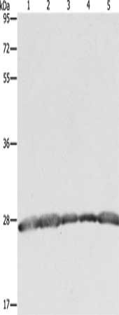 Gel: 10%SDS-PAGE, Lysate: 40 μg, Lane 1-5: Hela cells, 293T cells, MCF7 cells, human fetal brain tissue, Jurkat cells, Primary antibody: CSB-PA195573(PRDX3 Antibody) at dilution 1/800, Secondary antibody: Goat anti rabbit IgG at 1/8000 dilution, Exposure time: 2 seconds