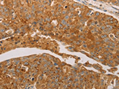 The image on the left is immunohistochemistry of paraffin-embedded Human liver cancer tissue using CSB-PA210969(PRDX3 Antibody) at dilution 1/50, on the right is treated with synthetic peptide. (Original magnification: ×200)