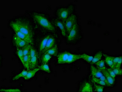 Immunofluorescent analysis of Hela cells using CSB-PA018689LA01HU at dilution of 1:100 and Alexa Fluor 488-congugated AffiniPure Goat Anti-Rabbit IgG(H+L)