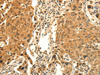 The image on the left is immunohistochemistry of paraffin-embedded Human lung cancer tissue using CSB-PA942370(PRKACG Antibody) at dilution 1/25, on the right is treated with fusion protein. (Original magnification: ×200)