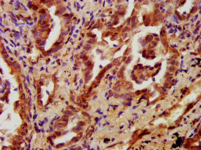 IHC image of CSB-PA15879A0Rb diluted at 1:700 and staining in paraffin-embedded human lung cancer performed on a Leica BondTM system. After dewaxing and hydration, antigen retrieval was mediated by high pressure in a citrate buffer (pH 6.0). Section was blocked with 10% normal goat serum 30min at RT. Then primary antibody (1% BSA) was incubated at 4°C overnight. The primary is detected by a biotinylated secondary antibody and visualized using an HRP conjugated SP system.
