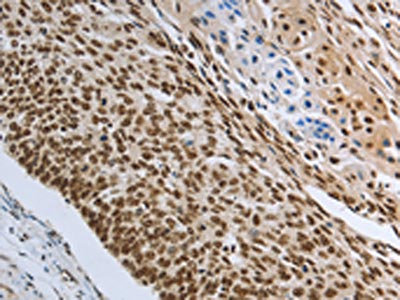The image on the left is immunohistochemistry of paraffin-embedded Human cervical cancer tissue using CSB-PA948631(PRMT3 Antibody) at dilution 1/30, on the right is treated with synthetic peptide. (Original magnification: ×200)