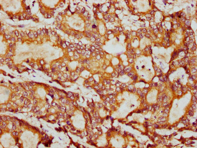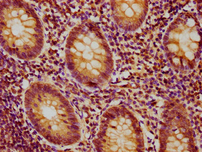 IHC image of CSB-PA018887LA01HU diluted at 1:400 and staining in paraffin-embedded human colon cancer performed on a Leica BondTM system. After dewaxing and hydration, antigen retrieval was mediated by high pressure in a citrate buffer (pH 6.0). Section was blocked with 10% normal goat serum 30min at RT. Then primary antibody (1% BSA) was incubated at 4°C overnight. The primary is detected by a biotinylated secondary antibody and visualized using an HRP conjugated SP system.