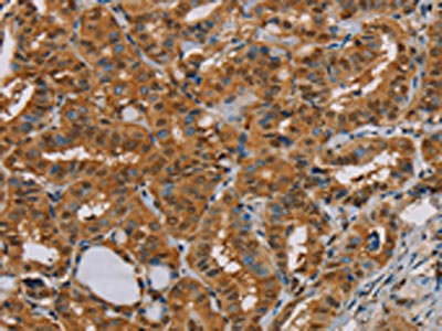 The image on the left is immunohistochemistry of paraffin-embedded Human thyroid cancer tissue using CSB-PA946590(PSMC2 Antibody) at dilution 1/25, on the right is treated with fusion protein. (Original magnification: ×200)