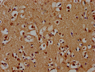 IHC image of CSB-PA018908HA01HU diluted at 1:100 and staining in paraffin-embedded human brain tissue performed on a Leica BondTM system. After dewaxing and hydration, antigen retrieval was mediated by high pressure in a citrate buffer (pH 6.0). Section was blocked with 10% normal goat serum 30min at RT. Then primary antibody (1% BSA) was incubated at 4°C overnight. The primary is detected by a biotinylated secondary antibody and visualized using an HRP conjugated SP system.