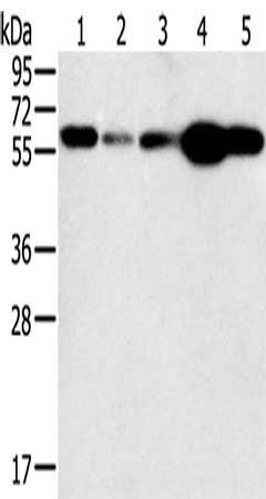 Gel: 10%SDS-PAGE, Lysate: 40 μg, Lane 1-5: Hela cells, Jurkat cells, mouse lung tissue, PC3 cells, mouse liver tissue, Primary antibody: CSB-PA546249(PTGER2 Antibody) at dilution 1/200, Secondary antibody: Goat anti rabbit IgG at 1/8000 dilution, Exposure time: 30 seconds