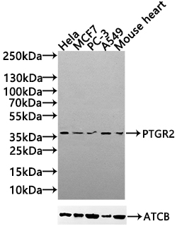Positive WB detected in: Hela whole cell lysate(30μg), MCF7 whole cell lysate(30μg), PC-3 whole cell lysate(30μg), A549 whole cell lysate(20μg), Mouse Heart tissue lysate(30μg)