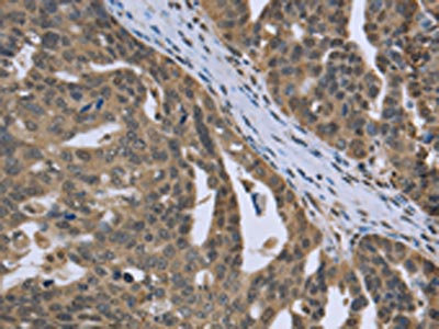 The image on the left is immunohistochemistry of paraffin-embedded Human ovarian cancer tissue using CSB-PA982747(PTK2B Antibody) at dilution 1/30, on the right is treated with fusion protein. (Original magnification: ×200)