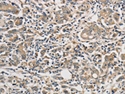 The image on the left is immunohistochemistry of paraffin-embedded Human gastric cancer tissue using CSB-PA223710(PTPN11 Antibody) at dilution 1/25, on the right is treated with fusion protein. (Original magnification: ×200)