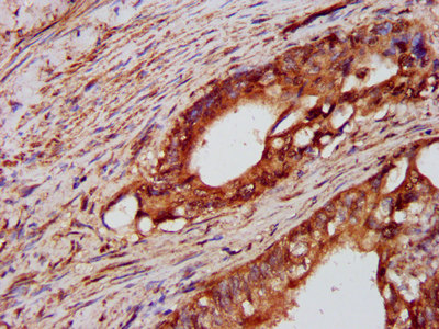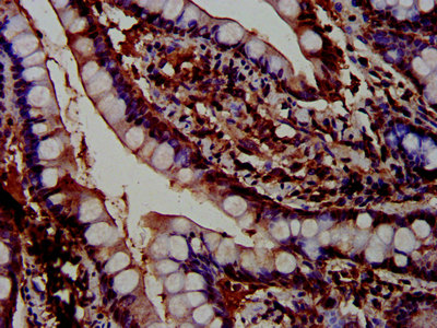 IHC image of CSB-PA019040LA01HU diluted at 1:600 and staining in paraffin-embedded human colon cancer performed on a Leica BondTM system. After dewaxing and hydration, antigen retrieval was mediated by high pressure in a citrate buffer (pH 6.0). Section was blocked with 10% normal goat serum 30min at RT. Then primary antibody (1% BSA) was incubated at 4°C overnight. The primary is detected by a biotinylated secondary antibody and visualized using an HRP conjugated SP system.