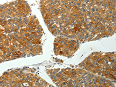 The image on the left is immunohistochemistry of paraffin-embedded Human liver cancer tissue using CSB-PA282609(PTPN6 Antibody) at dilution 1/35, on the right is treated with fusion protein. (Original magnification: ×200)