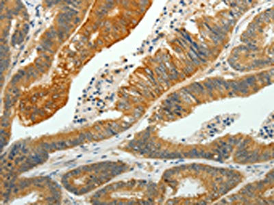 The image on the left is immunohistochemistry of paraffin-embedded Human colon cancer tissue using CSB-PA282609(PTPN6 Antibody) at dilution 1/35, on the right is treated with fusion protein. (Original magnification: ×200)