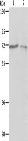 Gel: 10%SDS-PAGE, Lysate: 40 μg, Lane 1-2: A375 cells, A431 cells, Primary antibody: CSB-PA282609(PTPN6 Antibody) at dilution 1/500, Secondary antibody: Goat anti rabbit IgG at 1/8000 dilution, Exposure time: 90 seconds