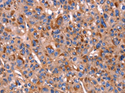 The image on the left is immunohistochemistry of paraffin-embedded Human liver cancer tissue using CSB-PA297000(PVR Antibody) at dilution 1/20, on the right is treated with fusion protein. (Original magnification: ×200)