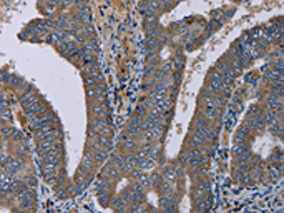 The image on the left is immunohistochemistry of paraffin-embedded Human colon cancer tissue using CSB-PA232987(PVRL4 Antibody) at dilution 1/40, on the right is treated with fusion protein. (Original magnification: ×200)