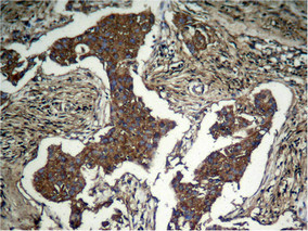 Immunohistochemical analysis of paraffinembeddedhuman Lung carcinoma tissue usingAkt (Phospho-Ser473) Antibody.