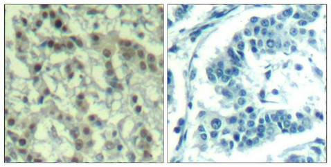 Immunohistochemical analysis of paraffin-embedded human breast carcinoma tissue using Aurora A(Phospho-Thr288) Antibody(left) or the same antibody preincubated with blocking peptide(right).
