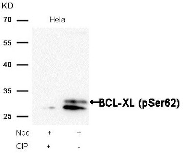 Western blot analysis of extracts from Hela cells, treated with Noc or calf intestinal phosphatase (CIP), using BCL-XL (Phospho-Ser62) Antibody.