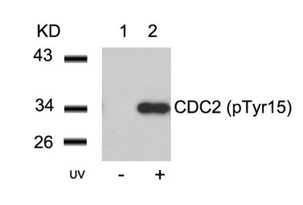 Western blot analysis of extracts from Hela cells untreated(lane 1) or treated with UV(lane 2) using CDC2(Phospho-Tyr15) Antibody.