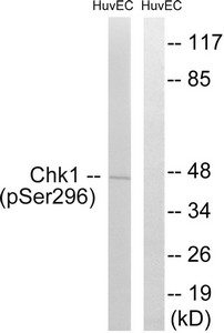 Western blot analysis of extracts from HUVEC cells treated with UV using Chk1 (Phospho-Ser296) Antibody.The lane on the right is treated with the antigen-specific peptide.