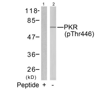 Western blot analysis of extracts from K562 cells using PKR(Phospho-Thr446) Antibody(Lane 2) and the same antibody preincubated with blocking peptide(Lane1).