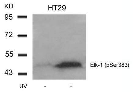 Western blot analysis of extracts from HT29 cells untreated or treated with UV using Elk-1(Phospho-Ser383) Antibody.