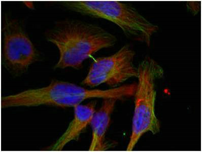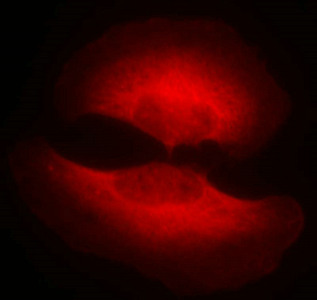 Immunofluorescence staining of methanol-fixed Hela cells showing cytoplasmic staining using GSK3β(Phospho-Ser9) Antibody.
