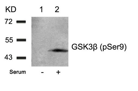 Western blot analysis of extracts from 293 cells untreated(lane 1) or treated with serum(lane 2) using GSK3β(Phospho-Ser9) Antibody.
