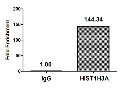 Chromatin Immunoprecipitation Hela (4*106) were treated with Micrococcal Nuclease, sonicated, and immunoprecipitated with 5µg anti-HIST1H3A (CSB-PA010418OA06phHU) or a control normal rabbit IgG. The resulting ChIP DNA was quantified using real-time PCR with primers against the β-Globin promoter.