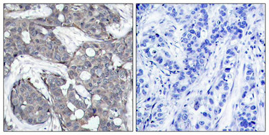 Immunohistochemical analysis of paraffin-embedded human breast carcinoma tissue using HSP27(Phospho-Ser82) Antibody(left) or the same antibody preincubated with blocking peptide(right).