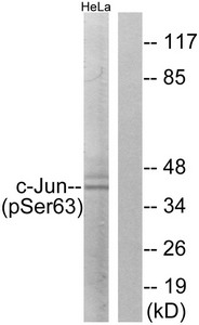 Western blot analysis of extracts from HeLa cells using c-Jun (Phospho-Ser63) Antibody.The lane on the right is treated with the antigen-specific peptide.