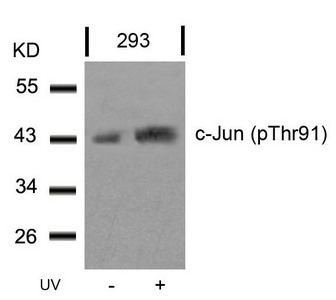 Western blot analysis of extracts from 293 cells untreated or treated with UV using c-Jun(Phospho-Thr91) Antibody.