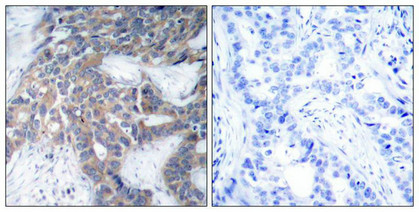 Immunohistochemical analysis of paraffin-embedded human breast carcinoma tissue using MEK1/MEK2(Phospho-Ser217/Ser221) Antibody(left) or the same antibody preincubated with blocking peptide(right).
