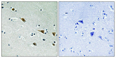Immunohistochemical analysis of paraffin-embedded humanbrain tissue, using MAP2K7 (Phospho-Ser271) antibody (left)or the same antibody preincubated with blocking peptide (right).