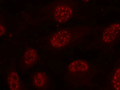 Immunofluorescence staining of methanol-fixed Hela cells using MAPKAPK-2(Phospho-Thr334) Antibody.