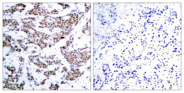 Immunohistochemical analysis of paraffin-embedded human breast carcinoma tissue using MEF2A(Phospho-Thr312) Antibody(left) or the same antibody preincubated with blocking peptide(right).