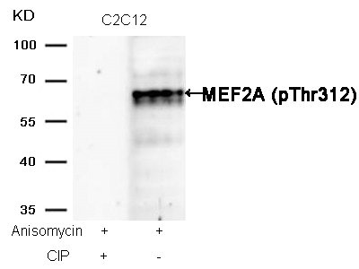 Western blot analysis of extracts from C2C12 cells, treated with Anisomycin or calf intestinal phosphatase (CIP), using MEF2A (Phospho-Thr312) Antibody.