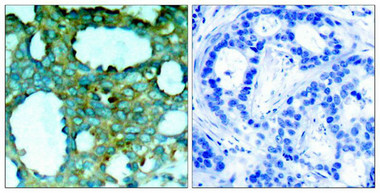 Immunohistochemical analysis of paraffin-embedded human breast carcinoma tissue using PAK1(Phospho-Thr212) Antibody(left) or the same antibody preincubated with blocking peptide(right).
