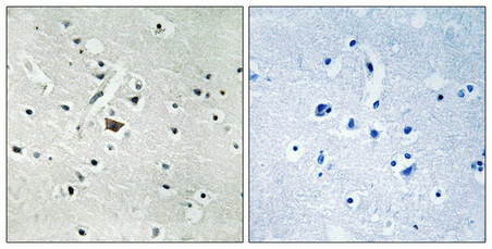 Immunohistochemical analysis of paraffin-embedded human brain tissue using PLD2 (Phospho-Tyr169) antibody (left)or the same antibody preincubated with blocking peptide (right).