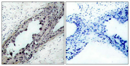 Immunohistochemical analysis of paraffin-embedded human breast carcinoma tissue, using PTEN(Phospho-Ser380/Thr382/Thr383) Antibody(left) or the same antibody preincubated with blocking peptide(right).