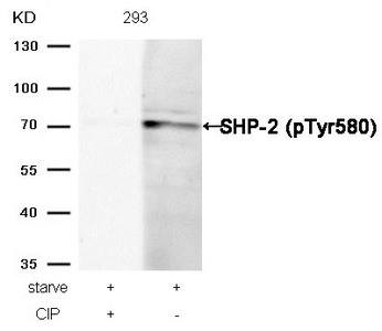 Western blot analysis of extracts from 293 cells, treated with starve or calf intestinal phosphatase (CIP), using SHP-2 (Phospho-Tyr580) Antibody.