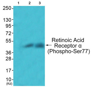 Western blot analysis of extracts from JK cells (Lane 2) and COS7 cells (Lane 3), using Retinoic Acid Receptor α (Phospho-Ser77) Antibody. The lane on the left is treated with synthesized peptide.