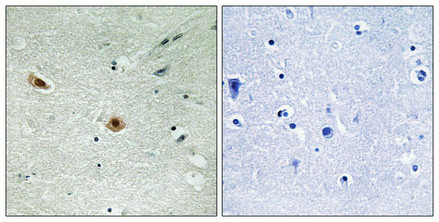 Immunohistochemical analysis of paraffin-embedded human brain tissue using Retinoblastoma (Phospho-Ser608) antibody (left)or the same antibody preincubated with blocking peptide (right).