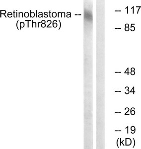 Western blot analysis of extracts from HepG2 cells, treated with nocodazole (1μg/ml, 16hours), using Retinoblastoma (Phospho-Thr826) antibody. The lane on the right is treated with the synthesized peptide.