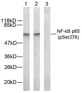 Western blot analysis of extract from Hela cells using NF-κB p65 (phospho-Ser276) antibody. Lane 1: The antibody is not preincubated with blocking peptides. Lane 2: The antibody is preincubated with non- phospho peptide blocking peptides. Lane 3: The antibody is preincubated with phospho peptide blocking peptides.