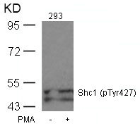 Western blot analysis of extracts from 293 cells untreated or treated with PMA using Shc1(Phospho-Tyr427) Antibody.